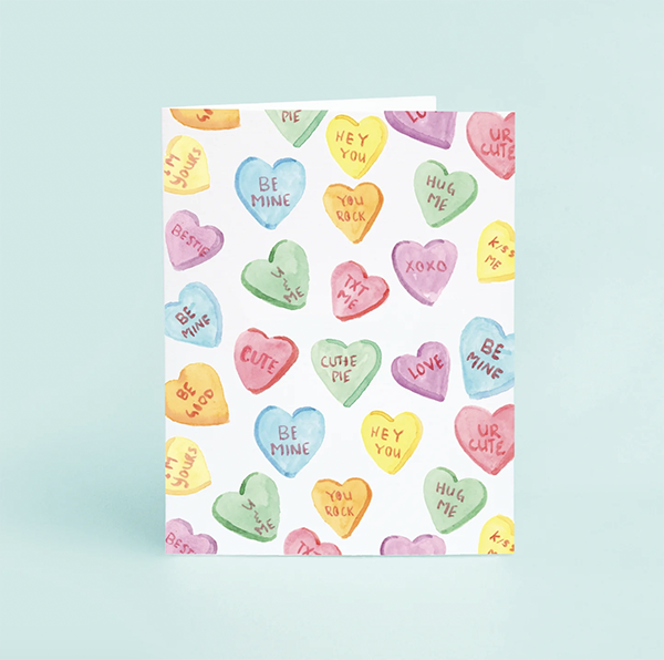 Send a message of love with this classic conversation hearts card! This card is perfect for any occasion, and the blank interior provides plenty of space for your personal message.